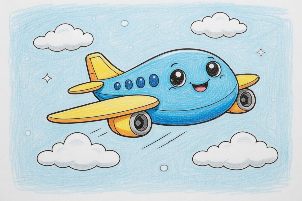 A cute airplane with a friendly smiling face flies in the sky. This simple black-and-white coloring page uses big shapes and clean outlines, making it perfect for kids ages 1–5 to color with ease.