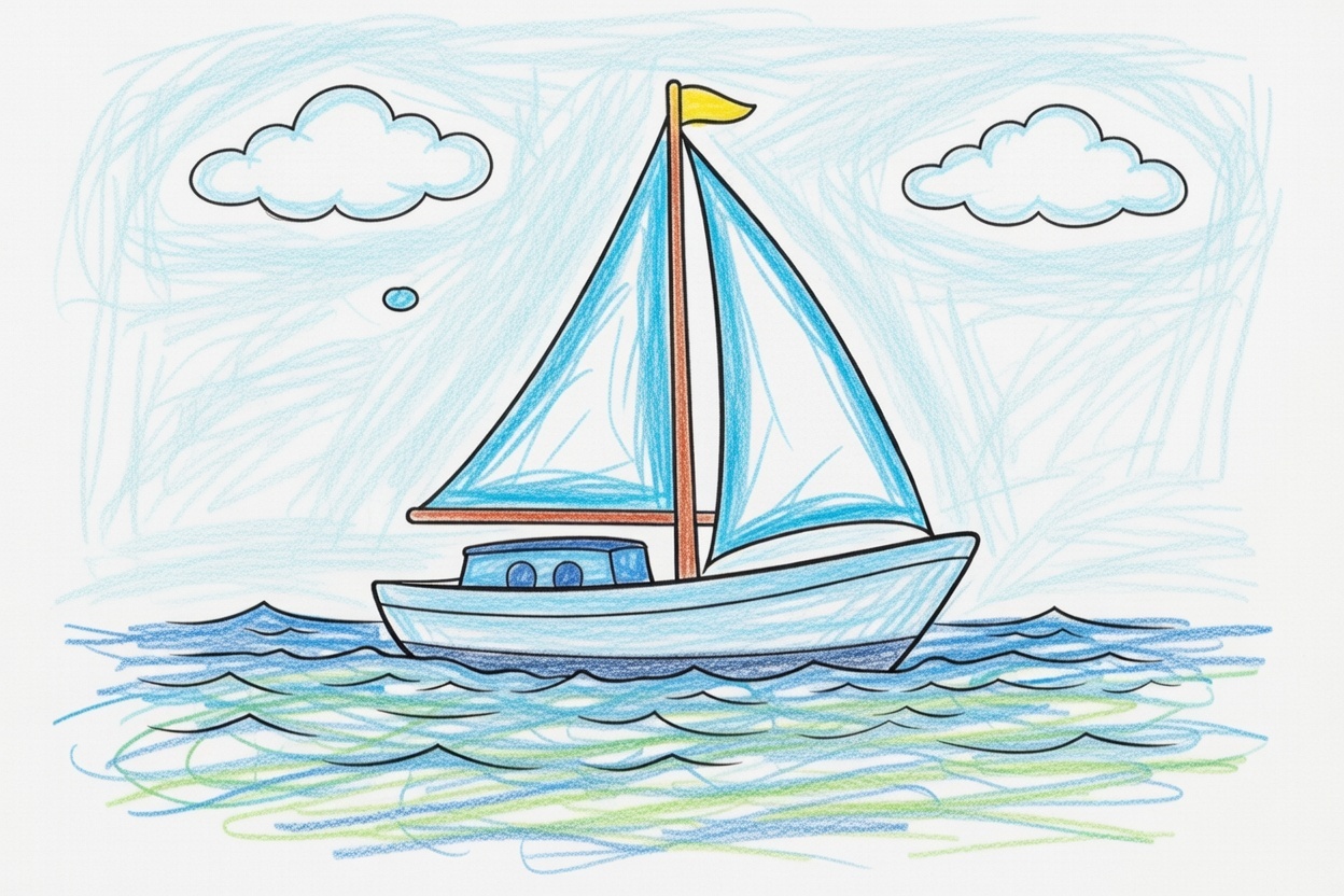 A small sailboat floats on the water with one big sail catching the wind. This simple black-and-white coloring page uses large shapes and clear lines, making it easy and fun for kids ages 1–5 to color.