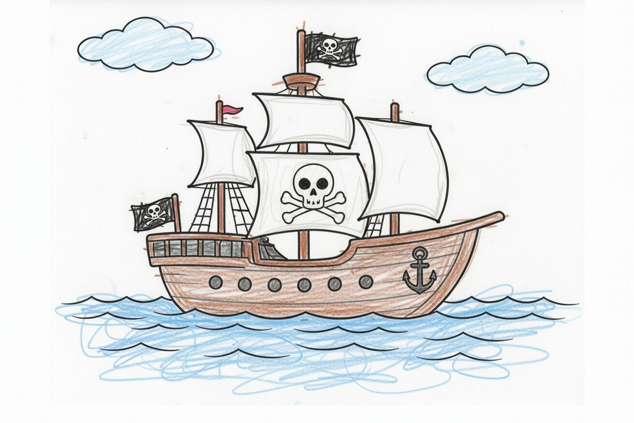 A big pirate ship sails on the sea with tall masts and a waving flag. This simple black-and-white coloring page uses large shapes and clear outlines, making it fun and easy for kids ages 1–5 to color.