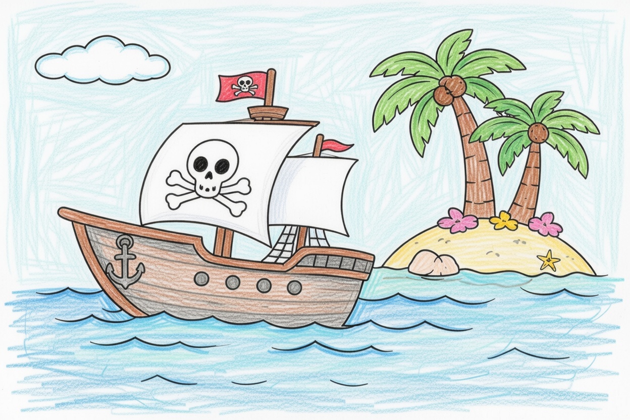 A pirate ship sails close to a small island with palm trees. This simple black-and-white coloring page uses large shapes and clean outlines with no small details, making it easy and fun for kids ages 1–5.