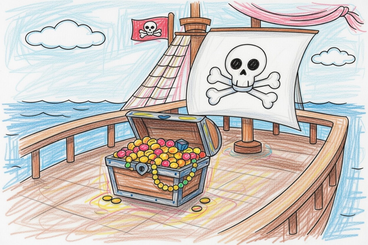 A pirate ship deck with a big treasure chest full of coins. This simple black-and-white coloring page shows the deck up close with large shapes and no small details, making it perfect for kids ages 1–5.
