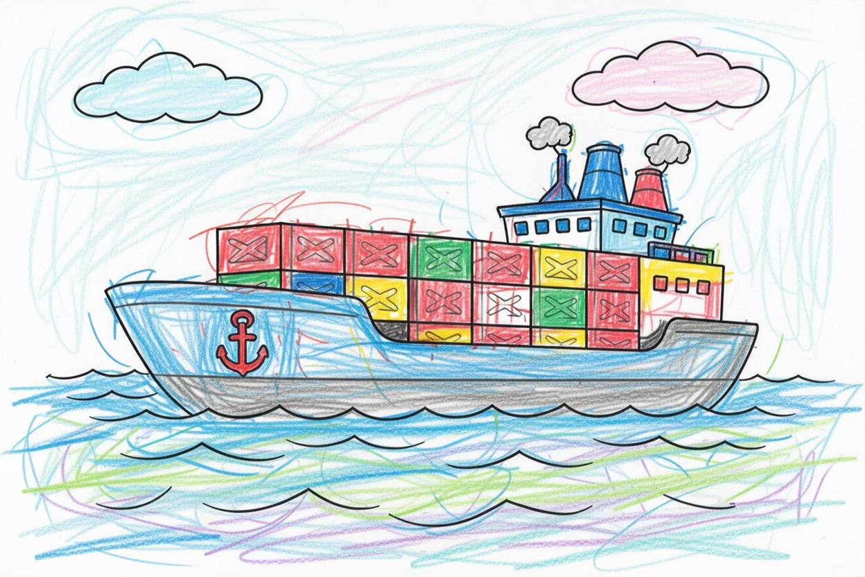 A big cargo ship sails across the sea carrying large boxes. This simple black-and-white coloring page uses clear outlines and big shapes with no small details, making it easy and fun for kids ages 1–5.