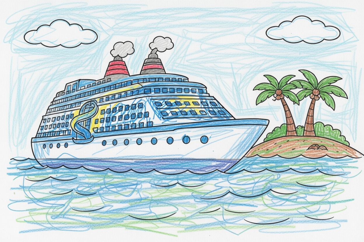A big cruise ship sails close to the shore on calm water. This simple black-and-white coloring page uses large shapes and clear outlines with minimal details, making it easy and fun for kids ages 1–5.