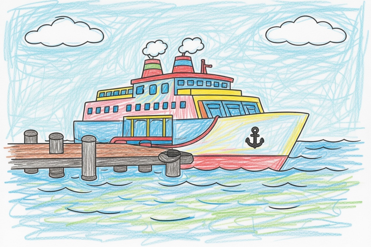 A big ferry is parked at the dock, ready to take passengers on board. This simple black-and-white coloring page uses large shapes and clear outlines, making it easy and fun for kids ages 1–5 to color.