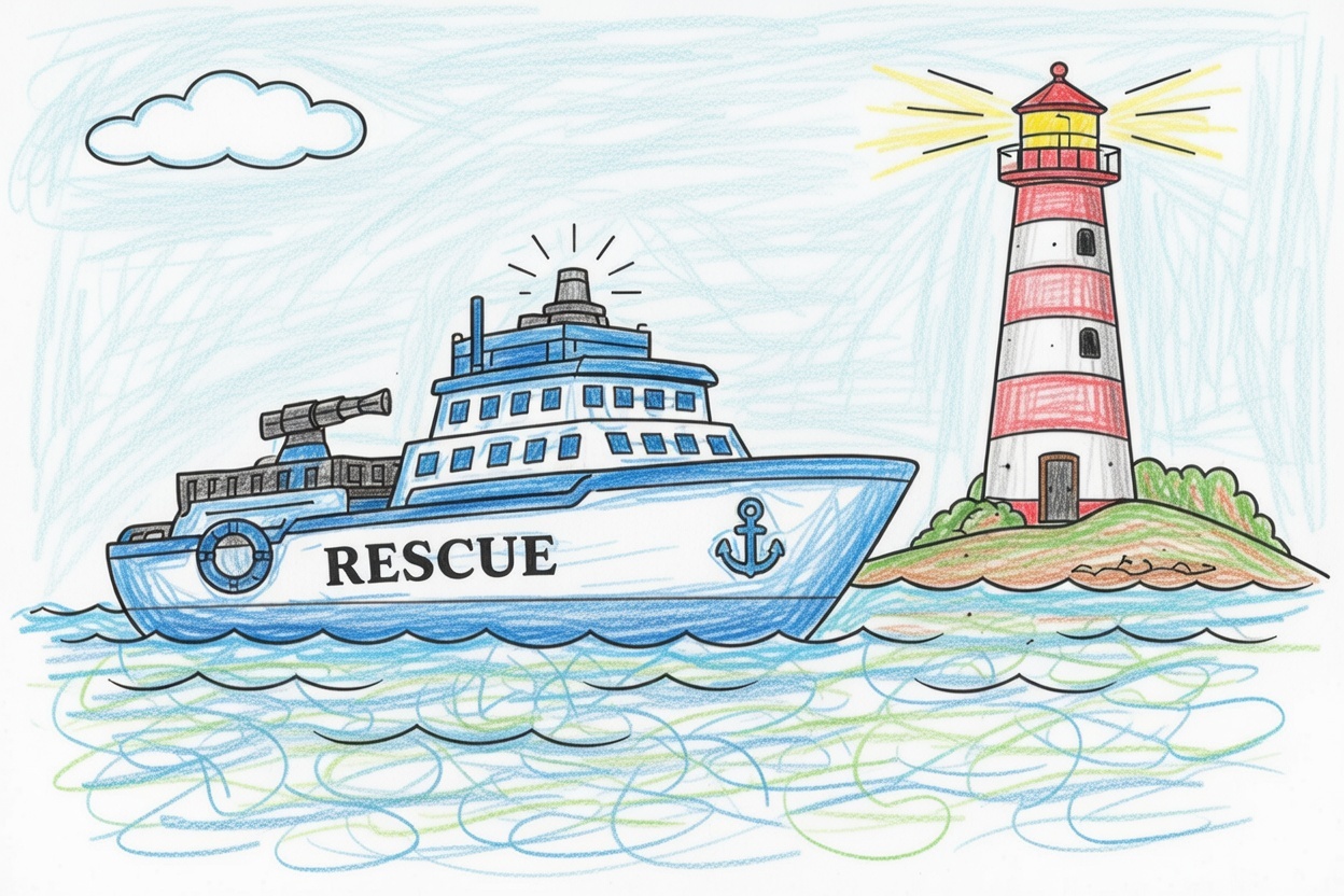 A rescue ship sails near a tall lighthouse by the shore. This simple black-and-white coloring page uses large shapes and clean outlines with minimal details, making it easy and fun for kids ages 1–5.