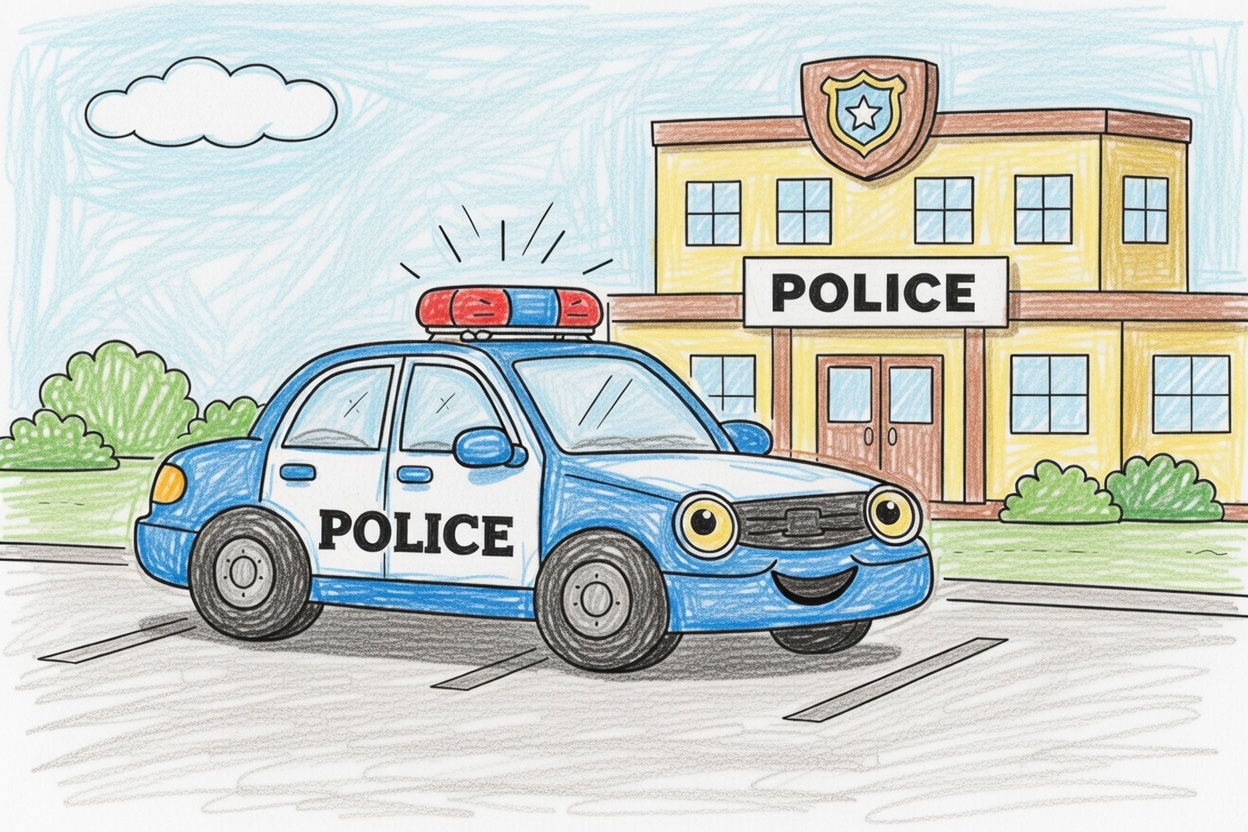 A friendly police car with a smile is parked in front of the police station. This simple black-and-white coloring page uses large shapes and clear outlines, making it easy and fun for kids ages 1–5 to color.