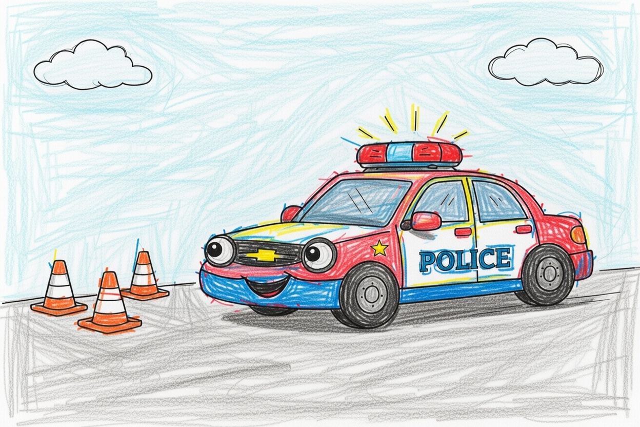 A friendly police car with a smile stands near traffic cones on the road. This simple black-and-white coloring page uses large shapes and clean outlines, making it easy and fun for kids ages 1–5 to color.