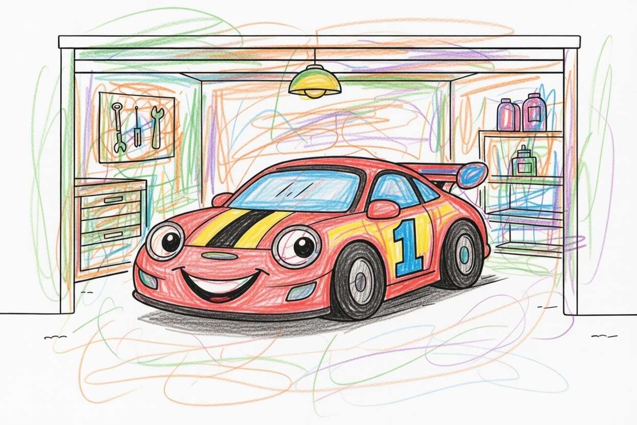 A race car is parked inside a simple garage, ready for the next race. This black-and-white coloring page uses large shapes and clean outlines with minimal details, making it easy for kids ages 1–5 to color.