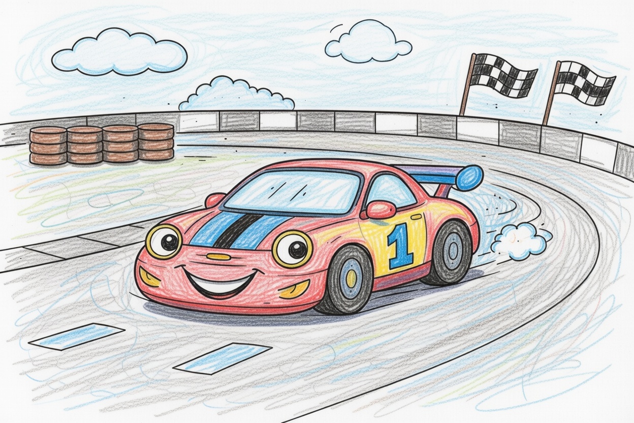 A fast race car drives along a simple racing track. This black-and-white coloring page uses large shapes and clear outlines with minimal details, making it easy and fun for kids ages 1–5 to color.
