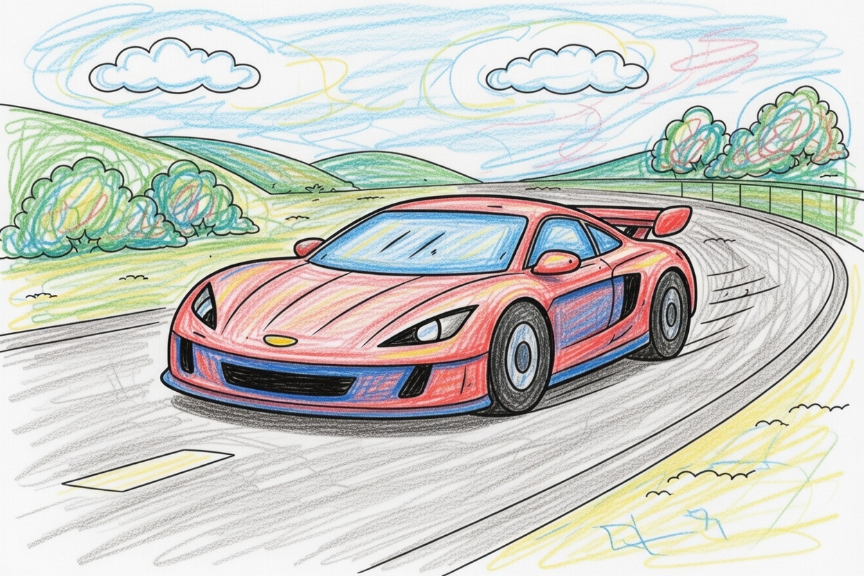 A sporty car drives along a simple road. This black-and-white coloring page uses big shapes and clear outlines with no small details, making it easy and fun for kids ages 1–5 to color.
