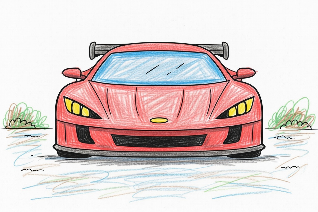 A sporty car is parked and seen from the front. This simple black-and-white coloring page focuses on the car’s shape with large parts and clean outlines, making it easy and fun for kids ages 1–5 to color.
