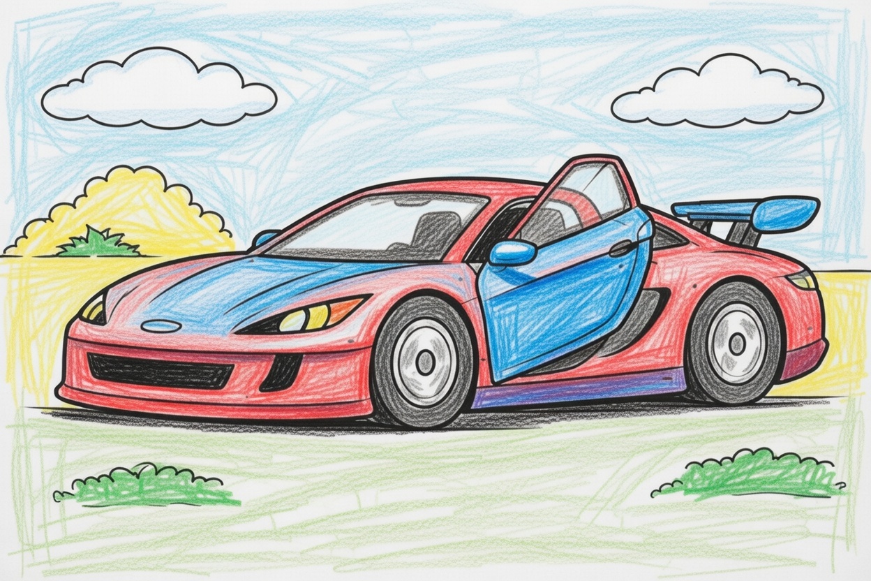 A sporty car is parked with one door open. This simple black-and-white coloring page shows an interesting but easy scene with large shapes and clean lines, perfect for kids ages 1–5 to color.