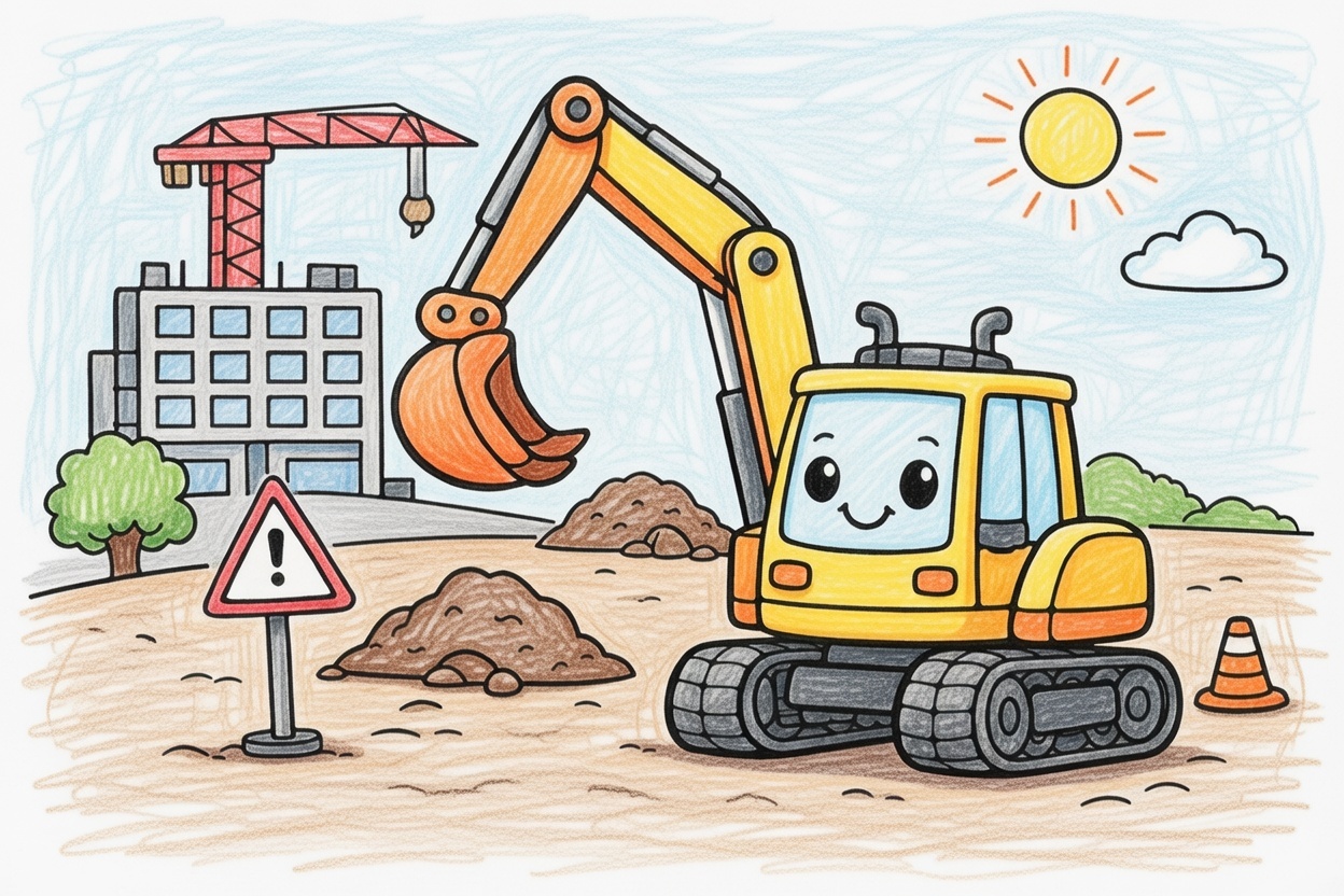 A friendly excavator works at a simple construction site, lifting soil with its arm. This easy coloring page with bold lines and large shapes helps young children enjoy vehicles, practice coloring, and develop fine motor skills.
