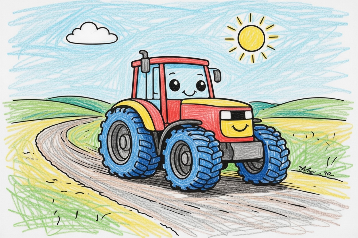 A friendly tractor drives along a simple road with smooth lines and a clear sense of movement. This calm coloring page uses big shapes and bold outlines, helping young children enjoy coloring and develop early motor skills.