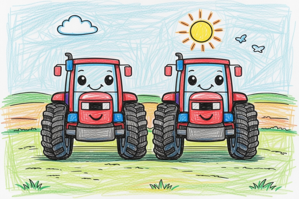 Two friendly tractors stand side by side and look straight ahead. This simple coloring page uses bold lines and big shapes, helping young children enjoy farm vehicles, feel togetherness, and practice easy coloring.