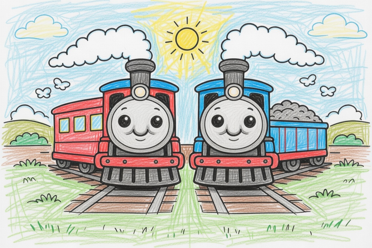 Two friendly steam trains stand side by side and look straight ahead. This simple coloring page uses bold lines and big, child-friendly shapes, helping young children enjoy trains, notice symmetry, and practice easy coloring.
