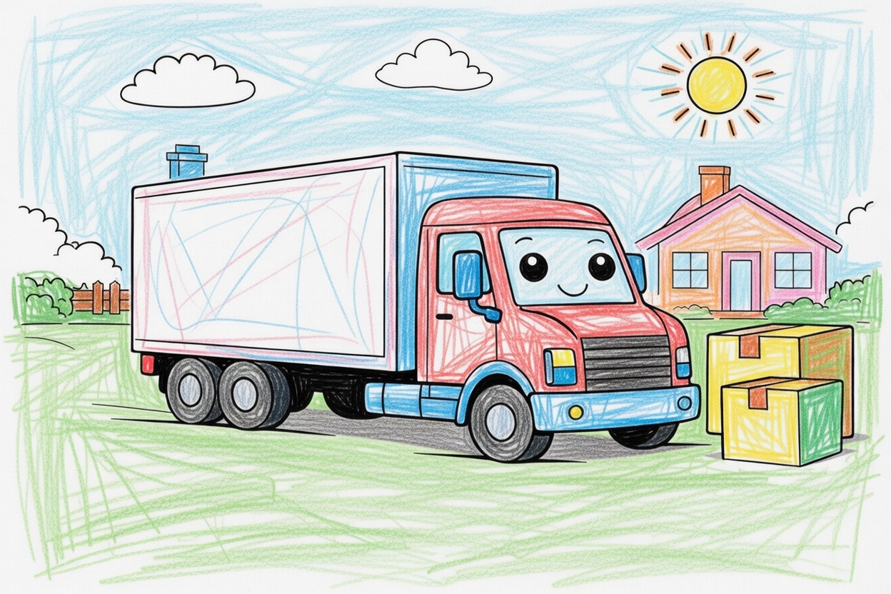 A delivery truck is parked near one or two big boxes, showing a clear delivery moment. This simple coloring page uses large shapes and clean lines, helping young children understand everyday transport and enjoy easy coloring.