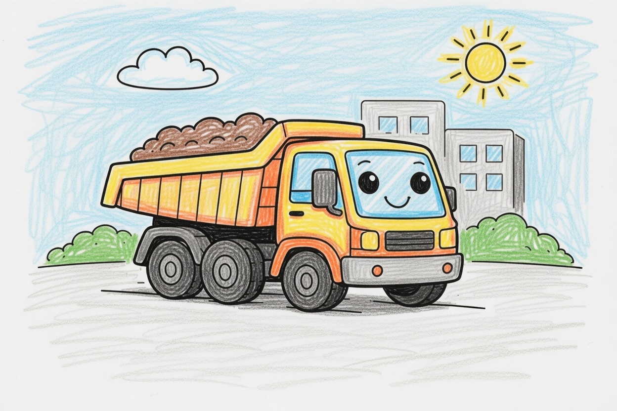 A small dump truck designed for city work drives along the road. It has a different cab shape and compact proportions. This simple coloring page uses large shapes and bold lines, making it easy and fun for young children to color.