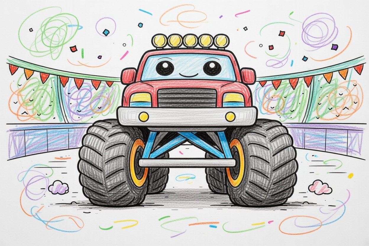 A big monster truck faces forward in a simple arena. Clean shapes, huge wheels, and a straight view keep the focus on the truck. This easy coloring page is calm, friendly, and perfect for young kids.