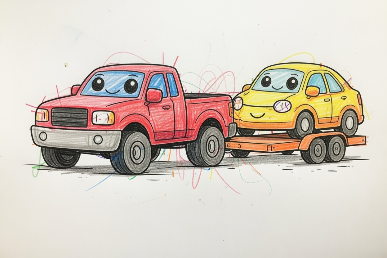 A friendly pickup truck tows a small car on a trailer. Both vehicles have simple faces on the windshield, showing a clear and calm helping scene. Clean shapes and smooth lines make this coloring page easy and fun for young children.
