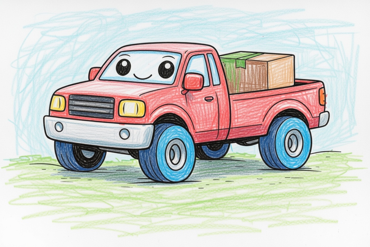 A friendly pickup truck carries one big item in its open cargo bed, like a box or a bag. Clean shapes and smooth lines keep the scene simple and clear, making this coloring page easy and fun for young children.