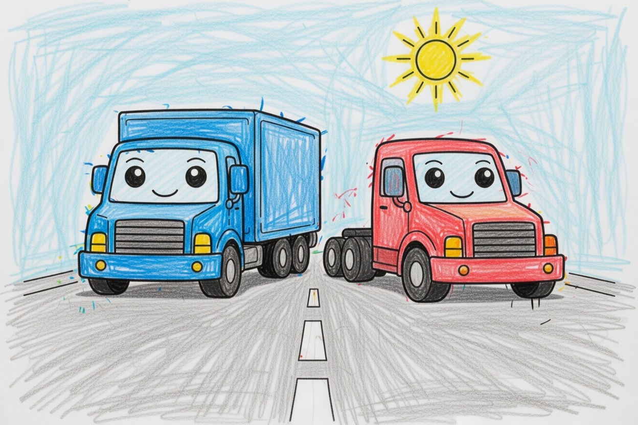 Two different trucks stand side by side and look straight ahead. Each truck has a different cab shape. This simple coloring page uses large shapes and bold lines, helping young children compare vehicles and enjoy easy coloring.